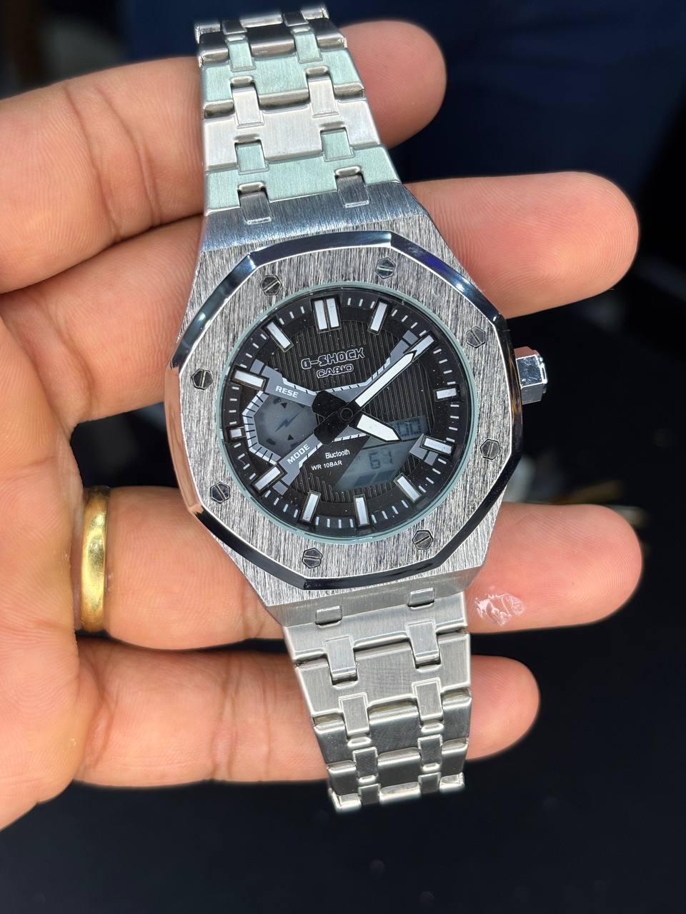 • Relógio todo em metal escovado