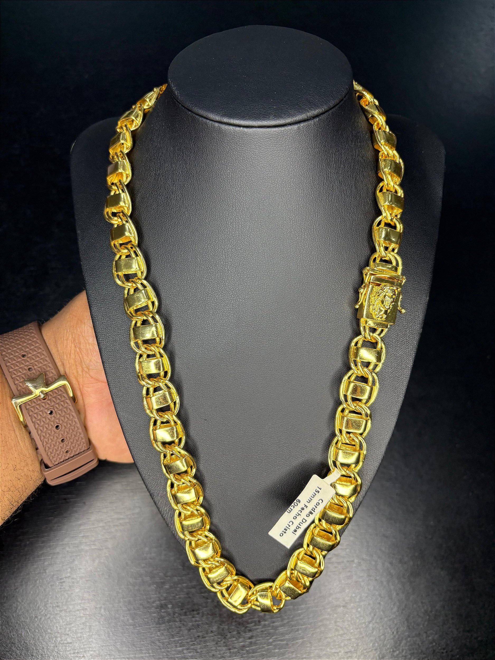 Elos soldados com precisão artesanal, acabamento polido com padrão de ourivesaria, garantindo peças que impressionam pelo brilho e pela resistência.
