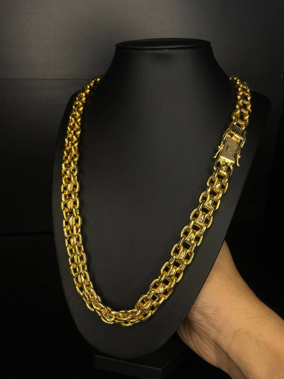 Elos soldados com precisão artesanal, acabamento polido com padrão de ourivesaria, garantindo peças que impressionam pelo brilho e pela resistência.